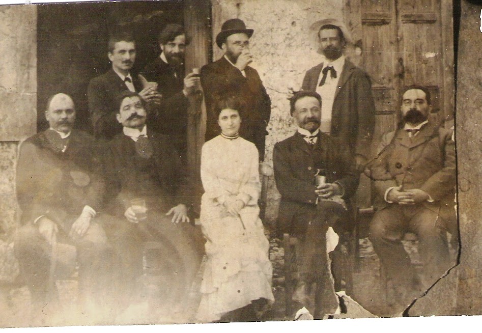 Η σύναξη των δημοτικιστών στο κερκυραϊκό χωριό Κορακιάνα (1901). Όρθιοι από αριστερά, πρώτος ο Κωνσταντίνος Θεοτόκης και τρίτος ο Λορέντζος Μαβίλης. Καθιστή στο κέντρο η ποιήτρια Ειρήνη Δενδρινού.