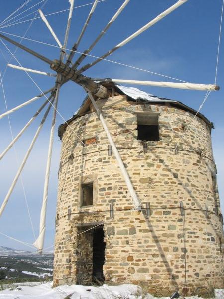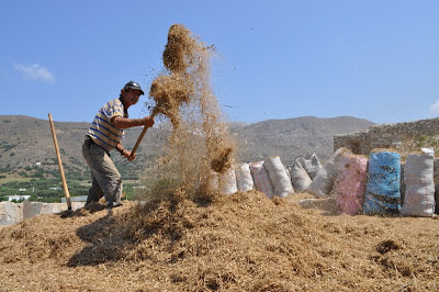 εσωτερικό νερόμυλου | Η καλλιέργεια σιτηρών ήταν πολύ διαδεδομένη μέχρι το 17ο αιώνα, ενώ στη συνέχεια περιορίστηκε σημαντικά. Οι άνθρωποι τότε φρόντιζαν δυο φορές το χρόνο, (φθινόπωρο - άνοιξη), για την παρασκευή του σταρένιου ή κριθαρένιου αλευριού. Μετέφεραν τα τσουβάλια τους το πρωί στο μύλο για άλεσμα και επέστρεφαν το βράδυ. Αλευρόμυλοι υπήρχαν σχεδόν σε όλα τα χωριά , οι περισσότεροι από τους οποίους ήταν υδρόμυλοι, δηλαδή τους κινούσε η δύναμη του νερού, οπότε τους έχτιζαν πάντα δίπλα σε ποτάμια και ρεματιές. Σήμερα λειτουργούν ελάχιστοι.Ο μύλος ήταν συνήθως και το σπίτι του μυλωνά. Κάτω από τις μυλόπετρες υπήρχε ένας μικρός χώρος, όπου ήταν εγκατεστημένος ο κινητός μηχανισμός, όπου έπεφτε από το ζουριό (χτιστός τοίχος με αυλάκι που περνούσε το νερό και έπεφτε κατακόρυφα στη άλλη άκρη) το νερό και τον περιέστρεφε. Ο αλεστικός μηχανισμός είχε δυο οριζόντιες κυλινδρικές μυλόπετρες, τη μια πάνω στην άλλη, με την κάτω ακίνητη. Το σιτάρι διοχετεύονταν ανάμεσά τους από μια τρύπα στο κέντρο της επάνω περιστρεφόμενης πέτρας. Με την κίνηση το σιτάρι ή το κριθάρι συνθλίβεται ανάμεσα στις πέτρες και μετατρέπεται σε σκόνη. Ως αμοιβή του ο μυλωνάς κράταγε ένα μέρος από τα αλεστικά (5-12%) και σπάνια έπαιρνε χρήματα. Οι υδρόμυλοι έπαιρναν ως αλεστικό δικαίωμα ένα "σινίκι" (= 6 οκάδες) για την άλεση 100 οκάδων σιτηρών .