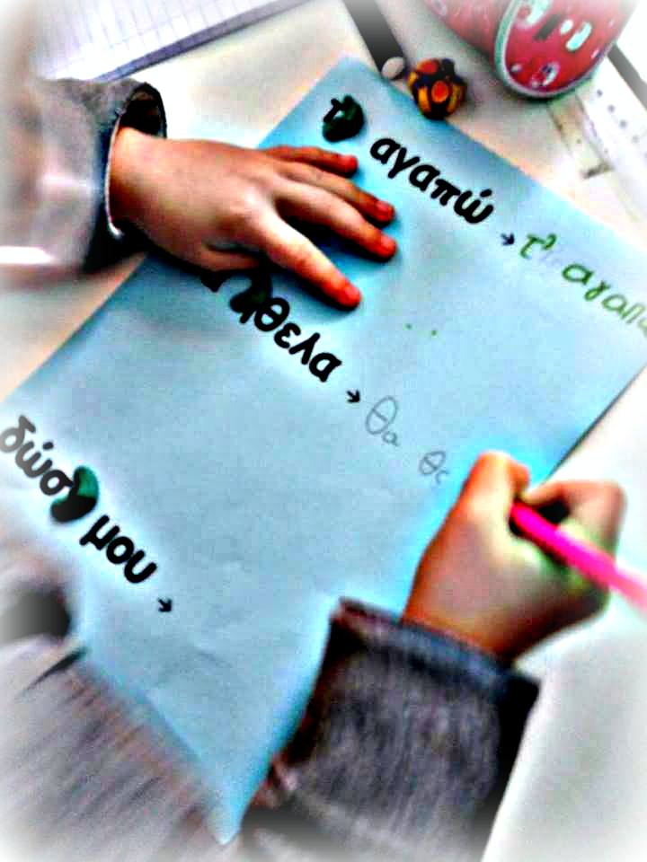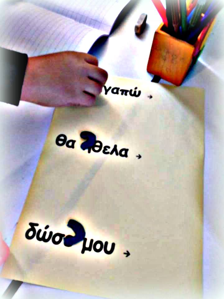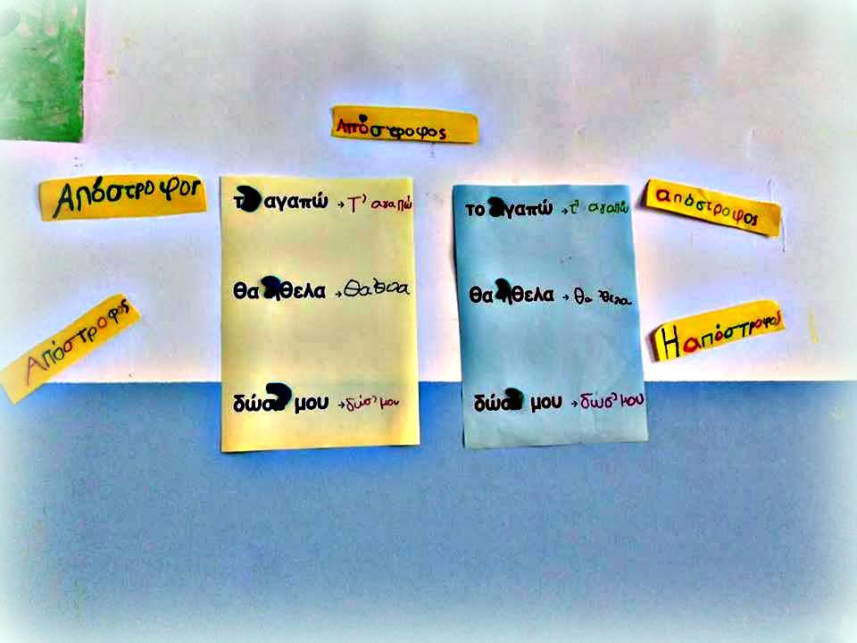 Oι μαθητές παίρνουν στα χέρια τους από ένα κομμάτι πλαστελίνης και του δίνουν το σχήμα της αποστρόφου. Στη συνέχεια κολλούν την πλαστελίνη – απόστροφο στο χαρτί με τις λέξεις που τους δίνεται! Απόστροφος