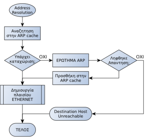 Συνοψίζοντας, το πακέτο IP κρατείται σε αναμονή και εκτελείται η διεργασία αντιστοίχησης διεύθυνσης IP προορισμού σε φυσική διεύθυνση Ethernet από το πρωτόκολλο ARP όπως φαίνεται στο διάγραμμα ροής. Μόλις αποκτηθεί η φυσική διεύθυνση προορισμού, δημιουργείται το πλαίσιο (frame) και αποστέλλεται στον υπολογιστή προορισμού.