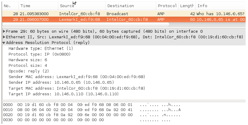 1. Στην επόμενη εικόνα φαίνεται ένα ερώτημα ARP (ARP request, Opcode: 1) όπως υποβλήθηκε από τον υπολογιστή με διεύθυνση IP 10.146.0.110 ο οποίος ερωτά ποια είναι η διεύθυνση Ethernet του υπολογιστή με διεύθυνση IP 10.146.0.65.